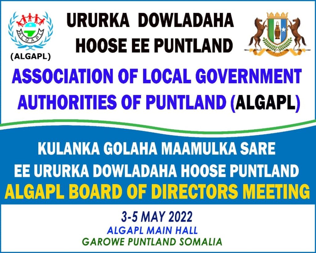 Garowe: 3 – 5 May 2022: Ururka Dowladaha Hoose ee Puntland (ALGAPL) oo qabtay shirka Golaha Sare ee Ururka, shirkan oo sanadkiiba sadex mar dhaca ayaa ujeedkiisu yahay in looga hadlo arimaha muhiim ka u ah horusocod ka ururka, lagu xaliyo caqabadaha taagan, laguna an sixiyo dhamaan shuruucda iyo habraacyada ururka iyo degmooyinka sidoo kale shirkan ayaa lagu qorsheeyaa noocyada tabobar iyo taageero ay u baahanyihiin degmooyinku.